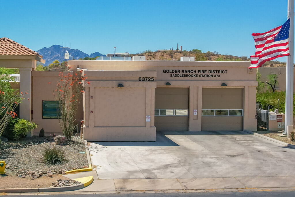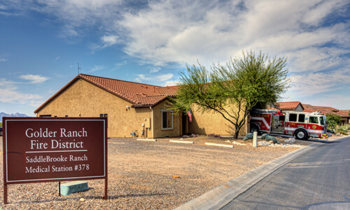 Located in SaddleBrooke Ranch, fire station 378 that houses an advanced life support engine went operational in 2009 as a temporary station. Built by the Robson community, and leased as a temporary station to GRFD it stands ready to go as the SaddleBrooke Ranch Community continues to grow. There are future plans to build a permanent fire station to accommodate the growth in the area.